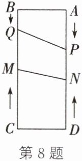8. (2024·来宾期中)如图,在矩形 $ABCD$ 中,$AB = 6\mathrm{cm}$,$BC = 15\mathrm{cm}$,点 $P$、$Q$、$M$、$N$ 分别从点 $A$、$B$、$C$、$D$ 同时出发,分别沿 $AD$、$BC$、$CB$、$DA$ 移动,且当有一个点先到达所在边的另一个端点时,其他各点也随之停止移动. 已知移动一段时间后,若 $BQ = x\mathrm{cm}(x \neq 0)$,则 $AP = 2x\mathrm{cm}$,$CM = 3x\mathrm{cm}$,$DN = x^2\mathrm{cm}$.