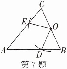 7. 如图,在△ABC中,∠A=50°,O是BC的中点,以点O为圆心,OB为半径作弧,分别交AB、AC于点D、E,连接OD、OE,则∠DOE为(