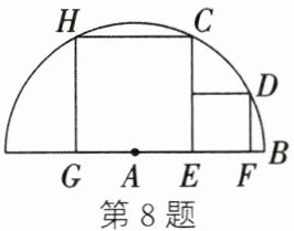8. 如图,两个正方形彼此相邻且顶点H、C、D在半圆上.若小正方形的面积为16cm²,则半圆的半径为(