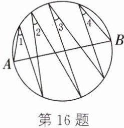 16. (转换法)(2024·连云港)如图,AB 是圆的直径,∠1、∠2、∠3、∠4 的顶点均在 AB 上方的圆弧上,∠1、∠4 的一边分别经过点 A、B,则∠1 + ∠2 + ∠3 + ∠4 =