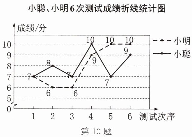 10. 小聪、小明准备代表班级参加学校“党史知识”竞赛,班主任对这两名同学测试了6次,获得如图所示的测试成绩折线统计图.根据图中信息,解答下列问题: