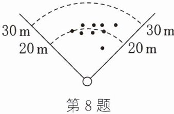 8. (2024·常州)小丽进行投掷标枪训练,总共投掷10次,前9次标枪的落点如图所示,记录成绩(单位:m),此时这组成绩的平均数是20 m,方差是$s_{1}^{2}m^{2}$.若第10次投掷标枪的落点恰好在20 m线上,且投掷结束后这组成绩的方差是$s_{2}^{2}m^{2}$,则$s_{1}^{2}$