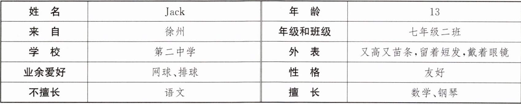I come from Xuzhou. I’m in Class 2, Grade 7. I am at No. 2 Middle School. I am tall and slim. I have short hair. I wear glasses. My hobbies are playing tennis and volleyball. I’m very friendly. I am good at Maths and playing the piano. I am not good at Chinese.