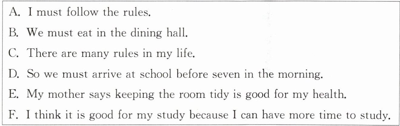 We need to wear the school uniform(校服). In class, we have to be quiet. We can't listen to music. We can't eat in class. 5. B
