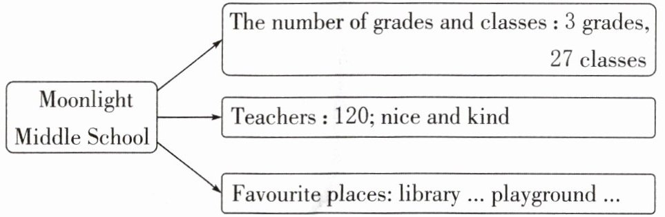 Now I study at Moonlight Middle School. The school is a nice one. It has 3 grades and 27 classes. There are many nice places in the school. My favourite places are the library and the playground. I often go to the library to borrow books. After school, I like to play ball games in the playground with my classmates. There are 120 teachers in the school. They are all nice and kind to us. I love my school a lot.