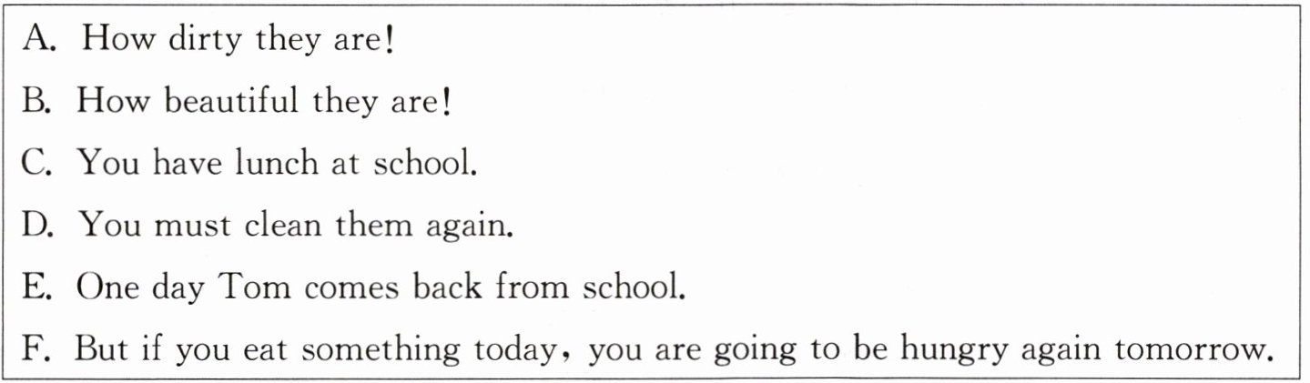 " "I don't want to clean them again. If I clean them today, they are going to be dirty again tomorrow. "Tom's mother thinks for a moment(一会儿) and says, "All right. "
