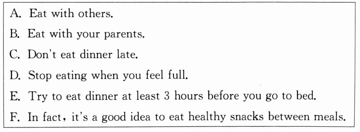 It can help you to see others' healthy eating habits. If you usually eat with your parents, you will find that the food you eat is more delicious.Listen to your body. Ask yourself if(是否) you are really hungry. Have a glass of water to see if you are thirsty—sometimes you are just thirsty, and you need no food. 2.