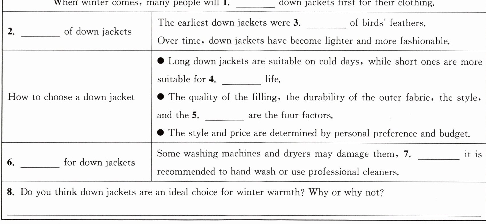 When choosing a down jacket, consider the following factors: the quality of the filling, the durability(耐用性) of the outer fabric, the style, and the price. High-quality down filling can provide better warmth, while a durable outer fabric can extend the life of the down jacket. The style and price are determined(决定) by what you like and how much money you plan to spend.