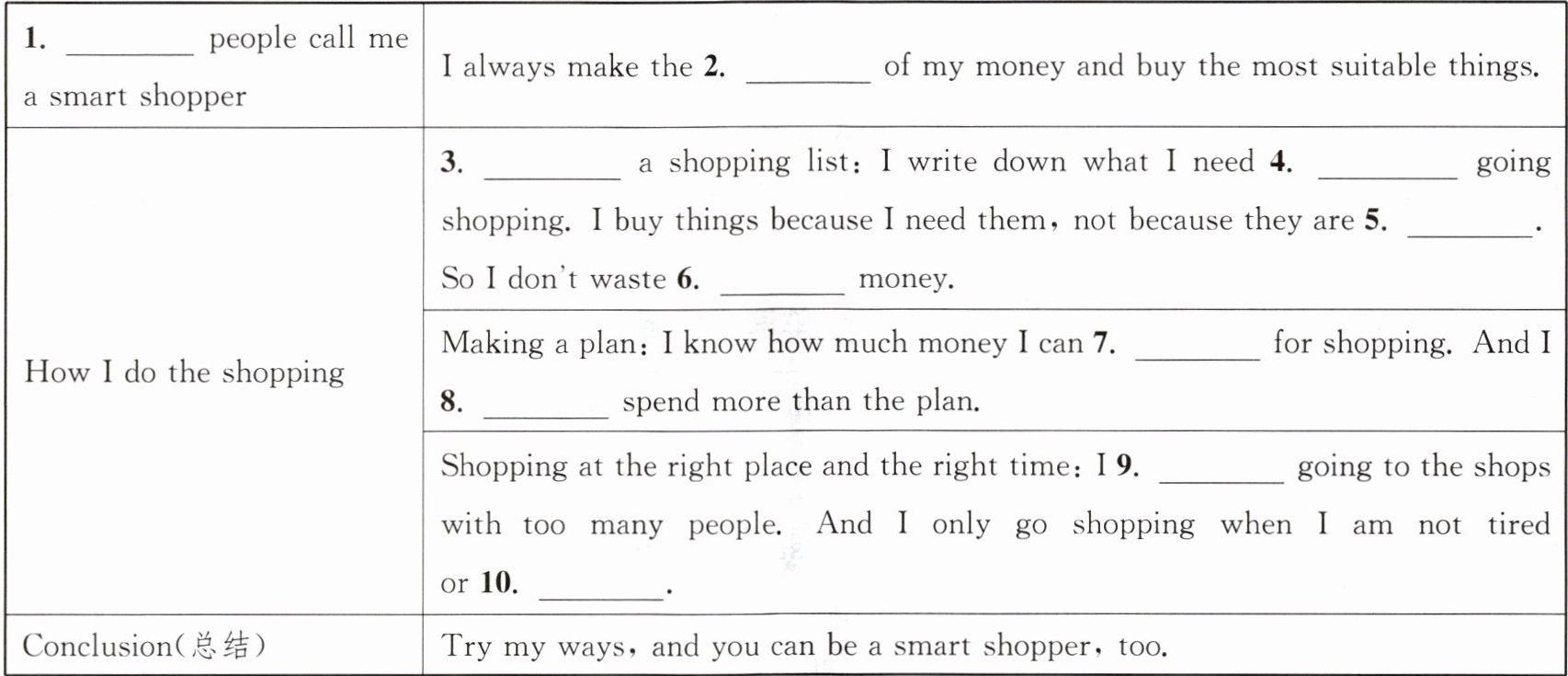 I usually go shopping at the right place and the right time. I don’t like to go to these shops with too many people. Too many people around me often make me spend more. And I don’t go shopping when I’m tired or hungry, so I don’t buy things in a hurry(匆忙). I go shopping after meals because walking helps me digest the food, too.