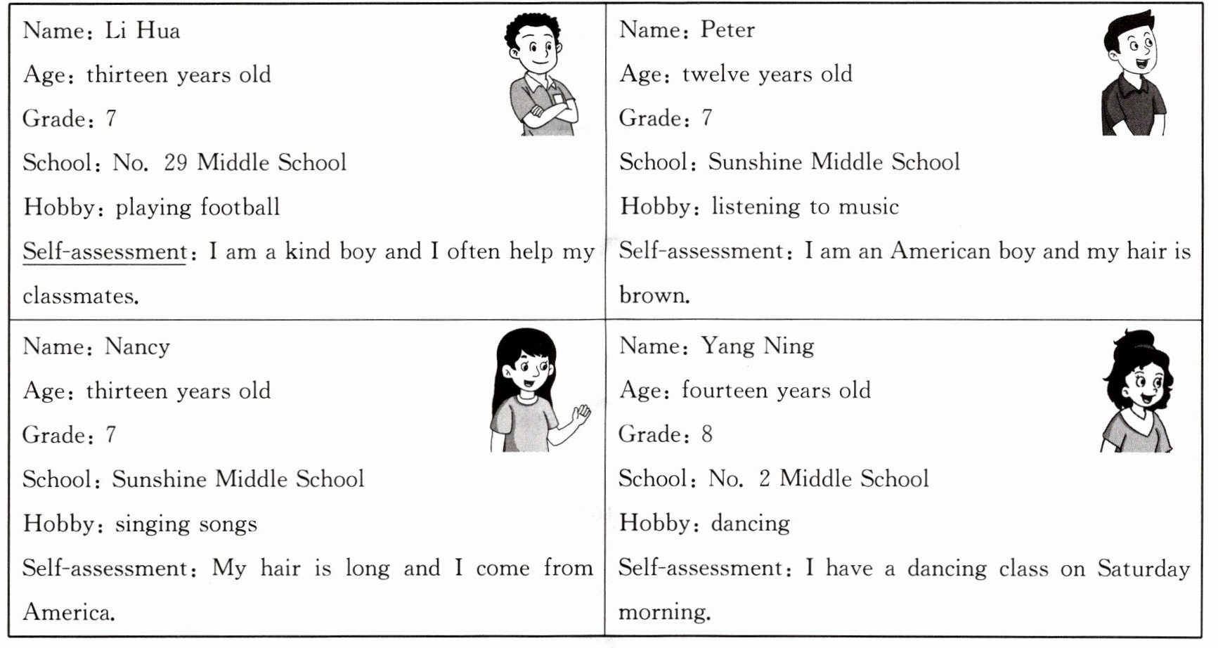 1. Li Hua and Nancy. 2. Peter. 3. Yang Ning. 4. “自我评价”. 5. On Saturday morning.