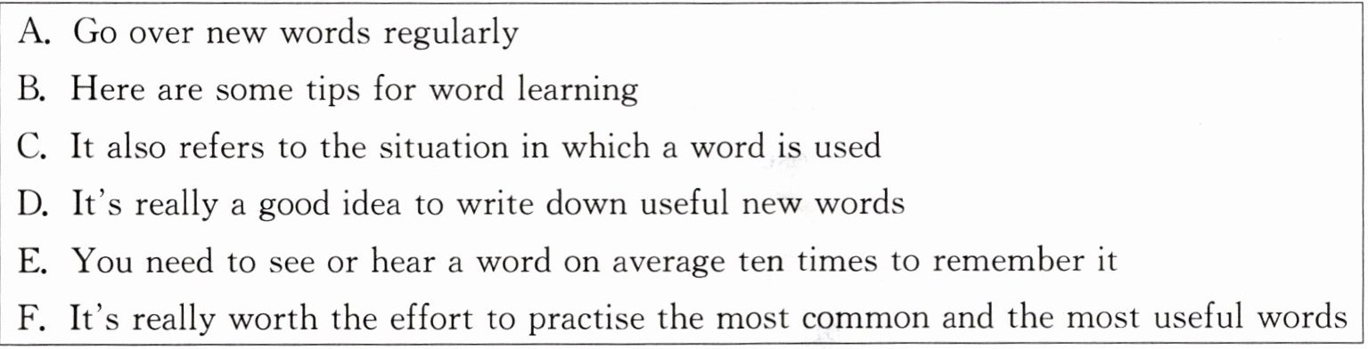 If you don't look again at the new words and phrases you've studied, you only remember on average 20~25 percent of them. If you look at your notes again after an hour, again the next day and once more a few days later, you can make sure that 100 percent of what you learn goes into your long - term memory. Make five minutes each day to revise your English words. The more you look backwards, the faster you go forwards!Learn from context Context means the text that comes before and after a particular word. 4.