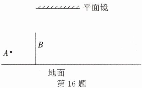 16. (易错题)如图所示,$ A $ 为暗室中的点光源,$ B $ 为不透光薄板,$ B $ 与上方水平放置的平面镜左边缘对齐,请画出 $ B $ 薄板右侧水平地面被光照亮的区域左右边界的光路图(只考虑直接经平面镜到达地面的光线)。