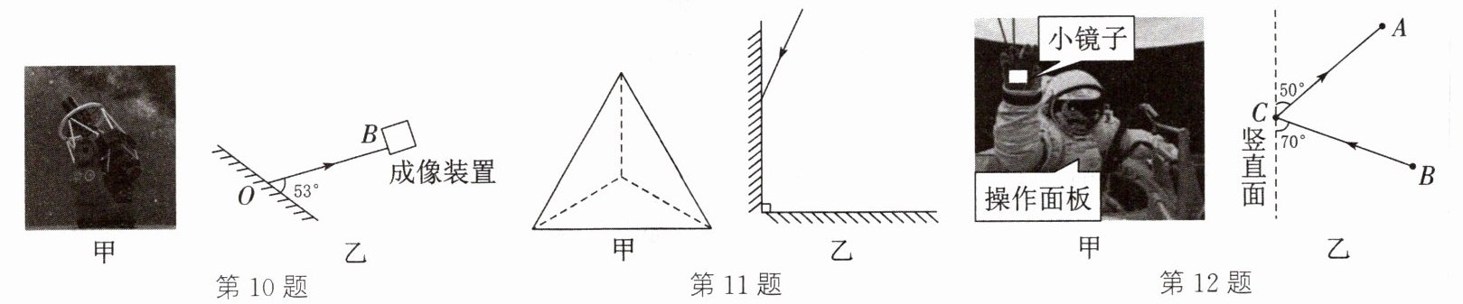 11. (2024·泸州)如图甲是随嫦娥六号一起发射的角反射器的示意图,其三个反射面相互垂直,其中两个反射面如图乙所示,一束光只在这两个反射面发生了反射,请在图乙中画出这束光反射的光路图(保留作图痕迹)。