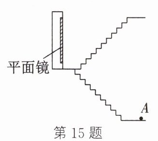 15. 如图所示,学校教学楼楼梯拐角处墙上装了一面镜子,在方便同学们日常整理仪容的同时,也能更好地在节电的情况下通过光的反射对楼道进行照明。请画出灯 $ S $ 在镜中的像 $ S' $ 及灯 $ S $ 经过镜子照射到下层楼道 $ A $ 点的光路。
