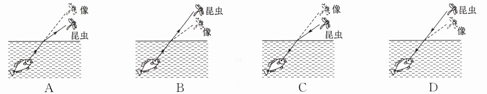 9. 喷水鱼因其特殊的捕食方式而得名,它能喷出一股水柱,准确击落空中的昆虫作为食物。下列各图中能正确表示喷水鱼看到昆虫像的光路图的是(