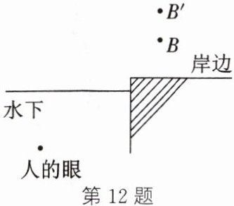 12. 如图所示,岸边有一物体B,潜水员从水中能看见B的像B',请画出眼睛能看到B'的折射光路图。