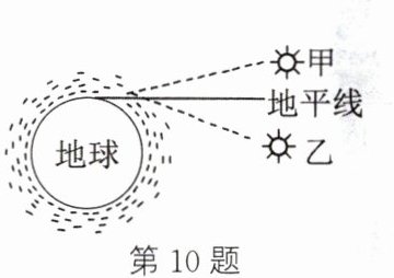 10. 诗句“大漠孤烟直,长河落日圆”给我们展现了一幅美丽的画面。如图所示,其实诗人观察到的落日并非太阳的实际位置,而是太阳光经过不均匀的大气层发生了
