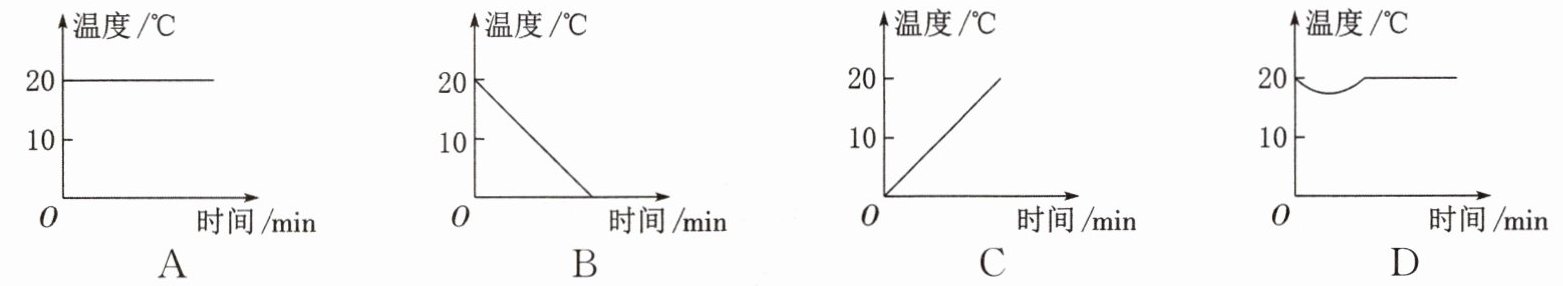 9. 当室内温度为$20^{\circ}C$时,用浸有少量酒精的棉花裹在温度计的玻璃泡上,随着酒精的迅速蒸发,下列反映温度计的读数随时间变化的图像,正确的是(