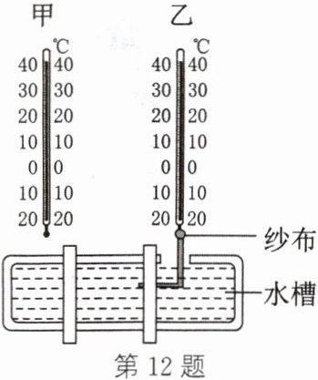 12. 有一种能反映空气中水蒸气含量的装置叫作干湿泡温度计。如图所示,它是由两支相同的温度计并列制成的,其中一支温度计被纱布包起来了。两支温度计的读数不一样,湿泡温度计的示数较