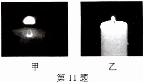 11. (2024·自贡荣县段考)“天宫课堂”第四课在空间站与地面同步探究了蜡烛燃烧实验。空间站蜡烛火焰呈球状(如图甲),地面实验蜡烛的火焰呈锥状(如图乙),而且空间站蜡烛火焰比地面实验显得微弱。下列分析正确的是(