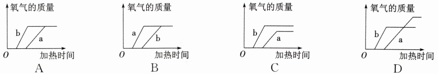11. 在a、b两支试管里分别装有等质量的氯酸钾,再向b试管中加入少量二氧化锰,同时加热。下列能正确表示两支试管中产生氧气的质量与加热时间关系的图像是