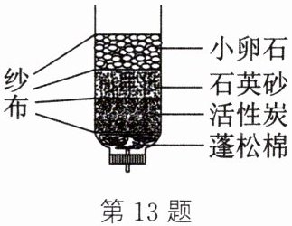 13. 取一个容积为1~1.2L的空塑料瓶,剪去瓶底,在瓶盖上打一个孔,在孔中插半根粗的塑料吸管,四周用胶带密封,旋紧瓶盖,将瓶倒置,在瓶内由下而上放置洗净的过滤层,如图所示,制成一个简易的净水器,取一个容器放在下面接水。