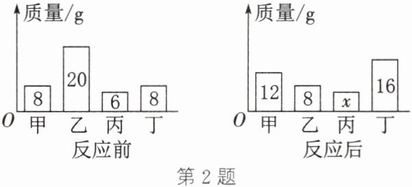 2.D 解析:由图中数据分析可知,反应前后甲的质量增加了12g - 8g = 4g,故是生成物,生成的质量为4g;同理可以确定乙是反应物,参加反应的质量为20g - 8g = 12g;丁是生成物,生成的质量为16g - 8g = 8g;由质量守恒定律,丙的质量为8g + 20g + 6g + 8g - 12g - 8g - 16g = 6g,故x的数值为6。任何化学反应均遵循质量守恒定律,故该反应遵循质量守恒定律,故选项A说法正确。反应前后丙的质量不变,可能为该反应的催化剂,也可能是没有参加反应的杂质,故选项B说法正确。反应前后乙和丁的质量变化之比为12g : 8g = 3 : 2,故选项C说法正确。由于不知反应中甲和丁的化学计量数之比,因此无法确定甲和丁的相对分子质量之比是否为1 : 2,故选项D说法错误。