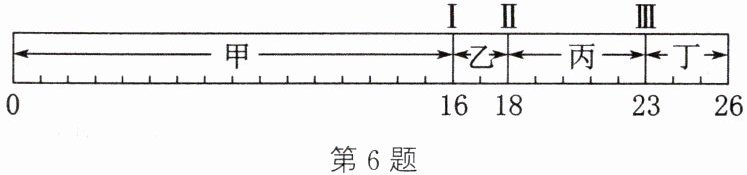 6. 在一密闭容器中,有甲、乙、丙、丁4种物质,反应前各物质的质量关系如图所示(例如:丙的质量为5g,丁的质量为3g),充分反应后,在同一张刻度纸上再次记录各物质的质量变化:刻度线Ⅰ向左移动16格;刻度线Ⅱ向左移动8格;刻度线Ⅲ向左移动8格。下列说法正确的是(