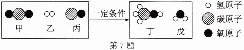 7. D 解析:甲是二氧化碳,丙是一氧化碳,丁是CH₄O,戊是水,甲、丙、戊均属于氧化物,CH₄O是由碳、氢、氧三种元素组成的化合物,不属于氧化物,故选项A说法错误。若以甲为原料与乙反应可获得清洁燃料丁,反应的化学方程式是$CO₂+3H₂\begin{matrix}$一定条件$\\=\!=\!=\!=\!=\!=\!=\!=\!=\!=\!=\!=\!=\!=\!=\!=\!=\!=\!=\!=\!\end{matrix}CH₄O+H₂O,$制取丁前后,分子总数发生了改变,故选项B说法错误。若生成的丁和戊分子数之比为5:3,则反应的化学方程式可能是$3CO₂+13H₂+2CO\begin{matrix}$一定条件$\\=\!=\!=\!=\!=\!=\!=\!=\!=\!=\!=\!=\!=\!=\!=\!=\!=\!=\!=\!=\!\end{matrix}5CH₄O+3H₂O,$消耗的甲和乙的分子数之比为3:13,故选项C说法错误。若某条件下甲、乙、丙混合反应后只新增戊这一种物质,根据质量守恒定律可得,该反应可能是$CO₂+H₂\begin{matrix}$一定条件$\\=\!=\!=\!=\!=\!=\!=\!=\!=\!=\!=\!=\!=\!=\!=\!=\!=\!=\!=\!=\!\end{matrix}CO+H₂O,$则丙应为生成物,则反应后丙将增多,故选项D说法正确。