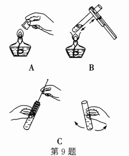 ,然后用酒精灯的外焰对准药品所在部位加热。(3)如图 C 所示,试管内壁附有不易洗掉的物质时,清洗试管一般先用试管刷蘸去污粉