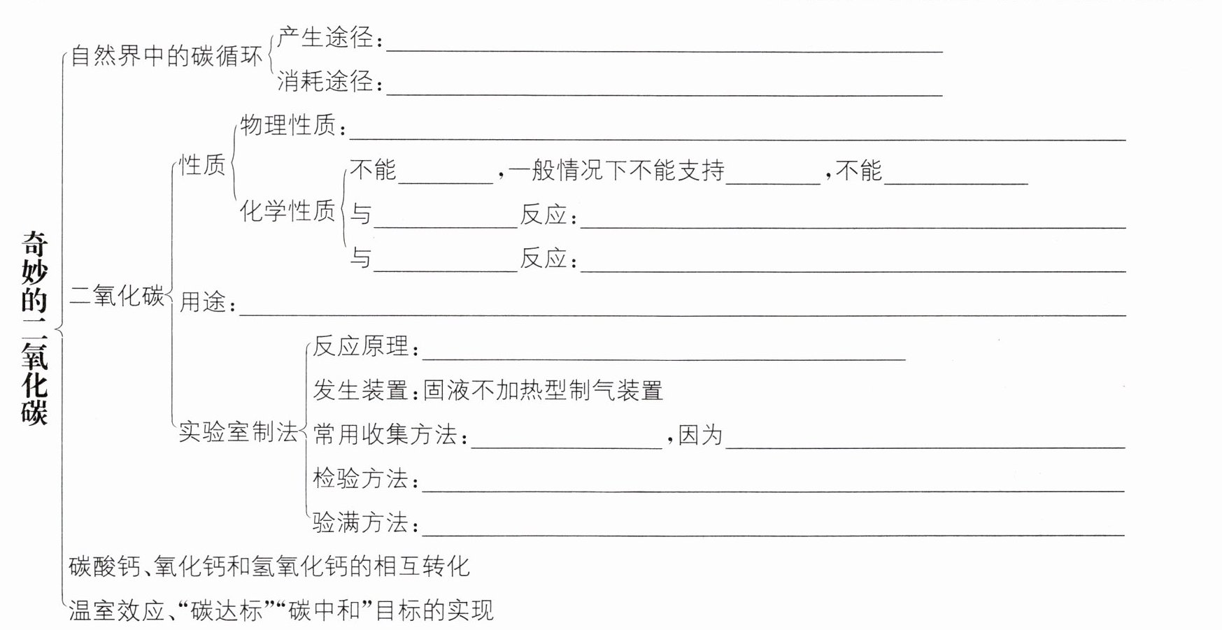 自然界中的碳循环 产生途径:含碳物质的燃烧、人和动植物(或生物)的呼吸作用和微生物的分解作用等 消耗途径:绿色植物的光合作用,溶于江河湖海,与水、氢氧化钙等物质反应 二氧化碳 性质 物理性质:通常状况下,二氧化碳是无色、无气味的气体,密度比空气大,能溶于水 化学性质 不能燃烧,一般情况下不能支持燃烧,不能供给呼吸 与水反应:$\mathrm{CO_2 + H_2O \longrightarrow H_2CO_3}$ 与澄清石灰水(或氢氧化钙)反应:$\mathrm{CO_2 + Ca(OH)_2 \longrightarrow CaCO_3 \downarrow + H_2O}$ 用途:用于灭火;作制冷剂,冷藏食品和人工增雨等;作粮食、蔬菜、瓜果的保护气;作化工原料;作气体肥料(合理答案均可) 实验室制法 反应原理:$\mathrm{CaCO_3 + 2HCl \longrightarrow CaCl_2 + H_2O + CO_2 \uparrow}$ 发生装置:固液不加热型制气装置 常用收集方法:向上排空气法,因为二氧化碳的密度比空气的大且不与空气中其他成分反应 检验方法:将产生的气体通入澄清石灰水中,若澄清石灰水变浑浊,则证明是$\mathrm{CO_2}$ 验满方法:将燃着的木条置于集气瓶口,若木条熄灭,则表明已集满(或用蘸有澄清石灰水的玻璃棒置于集气瓶口,若玻璃棒上出现白色固体,则表明二氧化碳已集满)