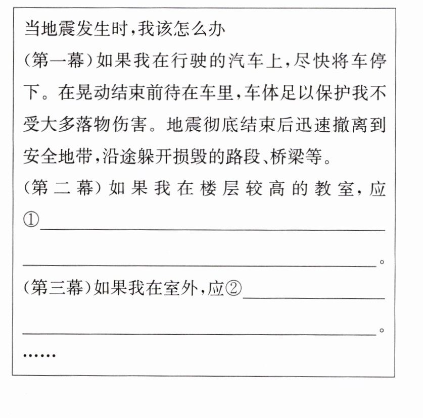 4. 地震对人类的生存与发展构成了极大的威胁,通过合理的应急措施,可以尽可能地减少地震发生过程中造成的危害。请根据下列场景,补充地震发生时的应急措施。