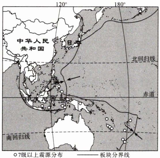 1. 印度尼西亚 亚 2. 印度洋 碰撞挤压 3. ① 喜马拉雅山脉是亚欧板块与印度洋板块挤压碰撞形成的。② 安第斯山脉是南极洲板块与美洲板块挤压碰撞形成的。③ 阿尔卑斯山脉是亚欧板块和非洲板块挤压碰撞形成的。④ 落基山脉是太平洋板块和美洲板块挤压碰撞形成的。⑤ 地中海面积不断缩小主要是由于亚欧板块和非洲板块不断挤压。⑥ 红海面积不断扩大是由于非洲板块和印度洋板块张裂拉伸等。 4. ① 迅速抱住头部,躲在课桌下或墙角处,并用书包等软物护住头部 ② 迅速撤离到空旷地带,远离高楼、大树、电线杆等
