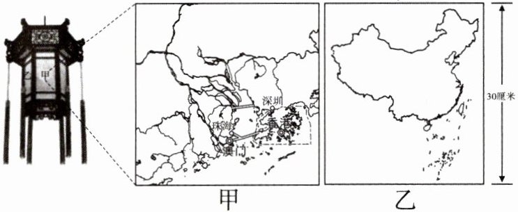 (地理计算)我国领土东西距离约 5 200 千米,南北距离约 5 500 千米。下图示意贝贝手绘“点亮中国”的宫灯设计图,图中的甲、乙分别为“粤港澳大湾区”和“中国竖版地图”的示意图。据此完成 4~6 题。