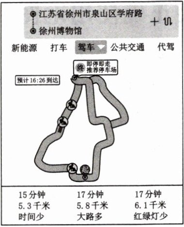(乡土地理)2025 年五一假期,家住徐州的小林同学计划和父母到徐州博物馆参观游览。如图示意小林同学用手机查询的交通出行信息。据此完成 7~9 题。