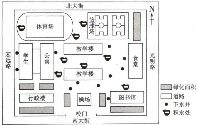 (4)校园地面硬化面积大,导致雨水下渗减少;连续较长时间降水或短时间暴雨,降水量超出了下水井的排泄能力。