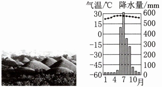 巧克力山是菲律宾薄荷岛的一处自然景观,由许多高低起伏的小山丘组成,山丘上的草在雨季时为绿色,在旱季会千枯变为褐色,犹如一排排巧克力放在大地上。下图为巧克力山景观图与薄荷岛气温曲线和降水量柱状图。据此完成5~7题。