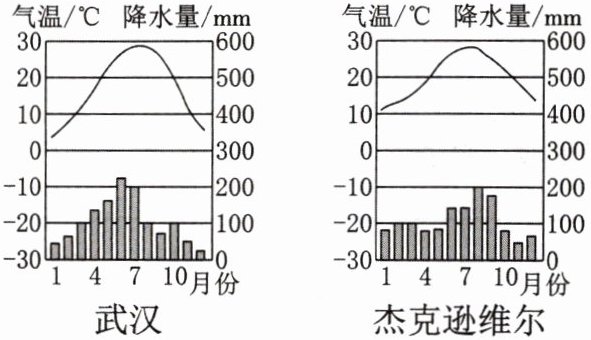 (区域对比)读武汉、杰克逊维尔的气温变化曲线和降水量柱状图,完成8一10题。