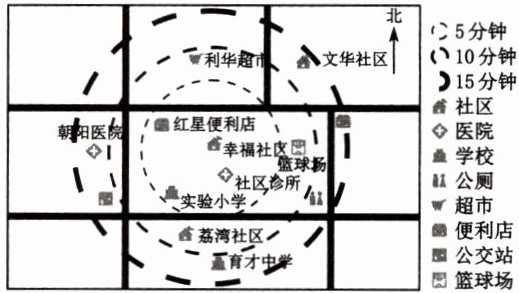 (2)题,从图中可以看到,社区诊所位于幸福社区的东南方向,并且位于步行5分钟圈的范围内,所以步行时间在5分钟以内。 故选A。