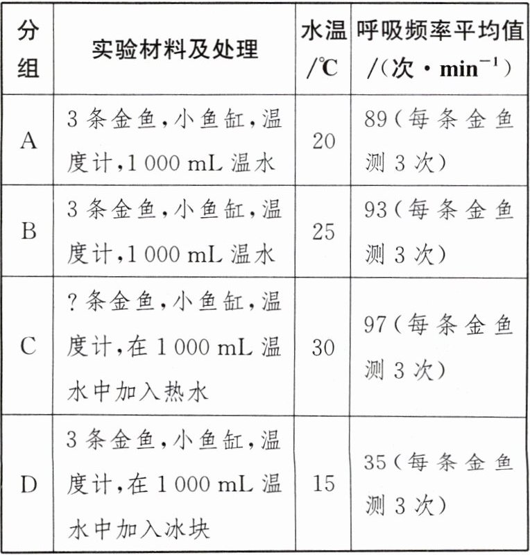 9. 金鱼是大家非常熟悉的小动物。在饲养金鱼时,控制好水温是很重要的。其中的原因是什么呢?某兴趣小组为了弄清楚其中的原因,设计了“探究水温的变化对金鱼呼吸频率的影响”的实验,实验过程及结果如下表: