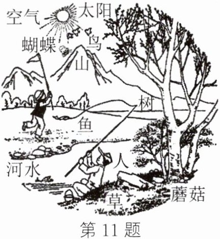 11 鱼、蝴蝶、蘑菇、草、鸟、树、人 太阳、空气、河水、山
