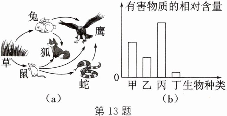 13. 图(a)表示某草原生态系统中的食物网,图(b)表示图(a)某条食物链中各生物体内有害物质的相对含量。请据图分析并回答问题: