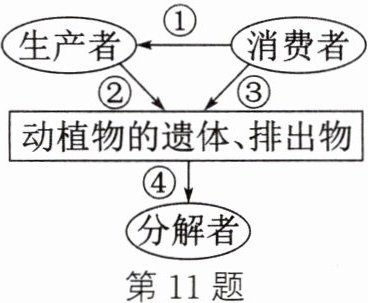 11. 如图所示为某生态系统中生产者、消费者和分解者之间的物质和能量流动的关系,图中箭头表示不正确的是(