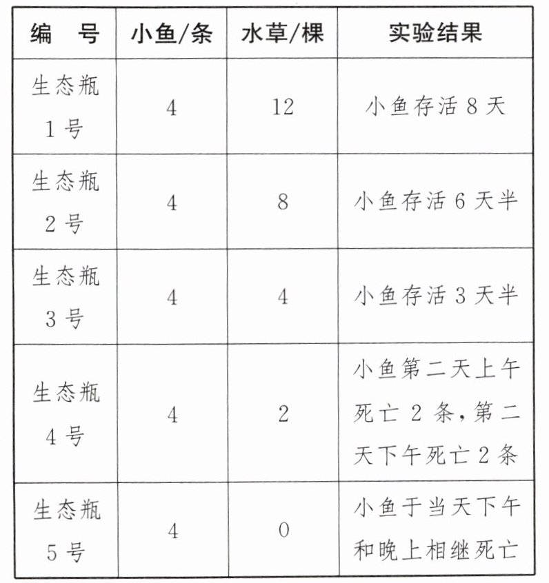 (填“光线良好”“阳光直射”或“没有光照”)处。(5)生物兴趣小组制作了五个生态瓶。下表为研究“一个小型生态系统中动物数量和植物数量关系”的实验数据。把这五个生态瓶都放在实验室窗台上,并使它们所处环境中的非生物因素基本相同。请分析数据并回答下列问题: