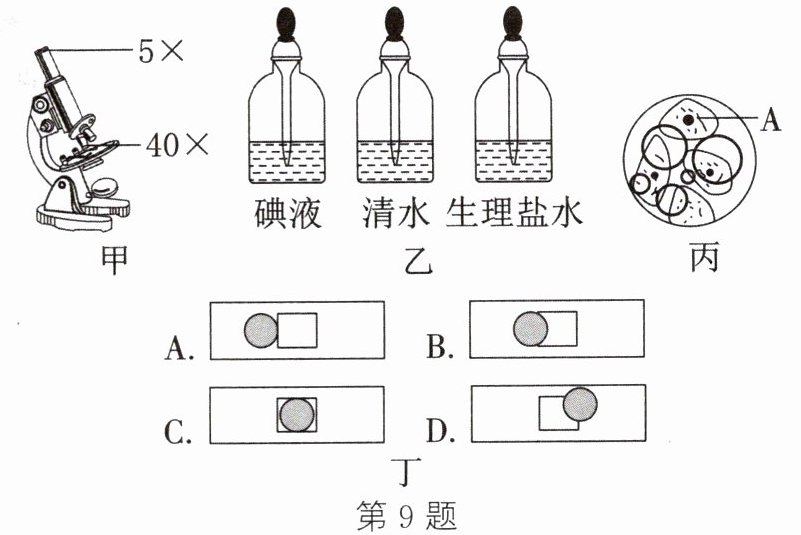 (填“上”或“下”)方移动。(5)在制作人口腔上皮细胞临时装片时(图丁中大空白长方形表示载玻片、小空白长方形表示盖玻片、灰色圆形表示碘液),滴碘液的位置正确的是