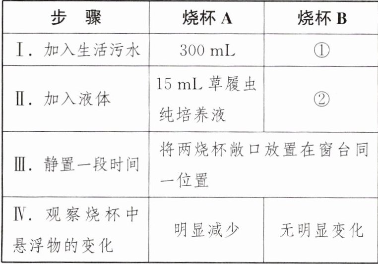 (2)为了探究草履虫是否可以净化水质,同学们收集了生活污水,摇匀后分别加入两个烧杯中,实验步骤如下表所示。