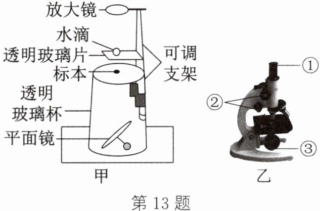 13. 某小组利用水滴、放大镜、平面镜、透明玻璃杯和可调支架等制作了一台“水滴显微镜”(图甲)。调节支架高度,适当调整标本、水滴和放大镜三者之间的距离,可实现与图乙所示光学显微镜相似的成像效果。