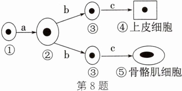 8.D 解析:a细胞生长过程中细胞体积增大,A正确;细胞分裂的结果是细胞数目增多,所以经过b细胞分裂后细胞的数目增多,B正确;经过c细胞分化后,细胞的形态、结构和功能发生变化,形成不同的组织,C正确;细胞经过生长、分裂和分化后遗传物质不发生改变,故④⑤与①细胞中的染色体数目相同,D错误。