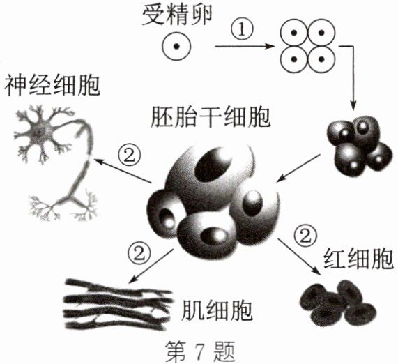 7. 胚胎干细胞是一种未分化的细胞,能分裂、分化出所有的组织和器官。研究和利用胚胎干细胞是当前生命科学领域的核心问题之一。