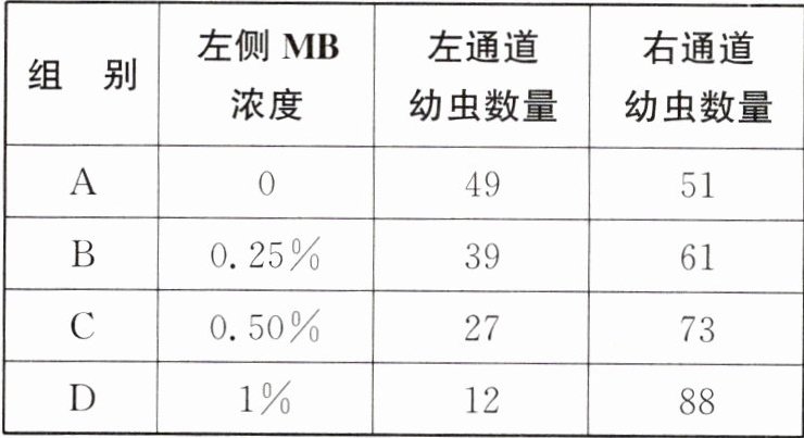 (3)根据表格的数据可知,所有添加MB的实验组左通道幼虫数量均比右通道少,且MB浓度越高,左通道幼虫数量越少,因此可以证明:实验条件下,苯甲酸甲酯对草地贪夜蛾幼虫的驱避效果显著,且苯甲酸甲酯浓度越高,驱避效果越好。